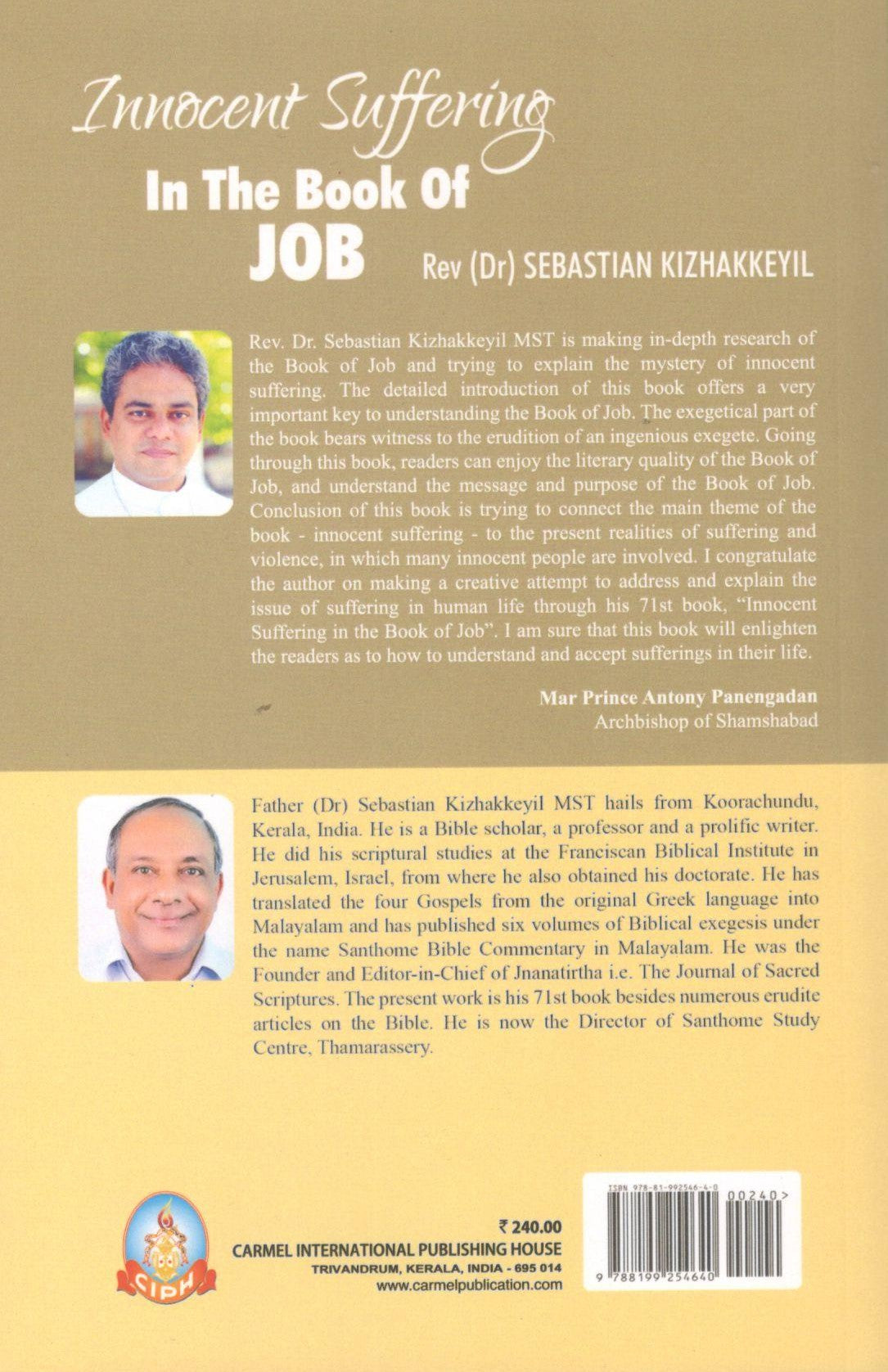 Innocent Suffering in the Book of Job by Sebastian Kizhakkeyil is a comprehensive exegetical guide to one of Scripture’s most profound questions: Why do the innocent suffer? Journeying deeply into the Book of Job, this work unfolds the mystery of human suffering under the light of divine wisdom. Through complete structural and theological analysis, it examines Job’s trials, his dialogue with friends, and his ultimate encounter with God. With systematic exegesis of all 42 chapters, character studies, and a rich exploration of retribution theology and divine wisdom, this commentary offers both scholarly depth and spiritual insight. An indispensable resource for homilies, Bible study, seminarians, and all who seek to understand the wisdom and faith revealed in Job’s story