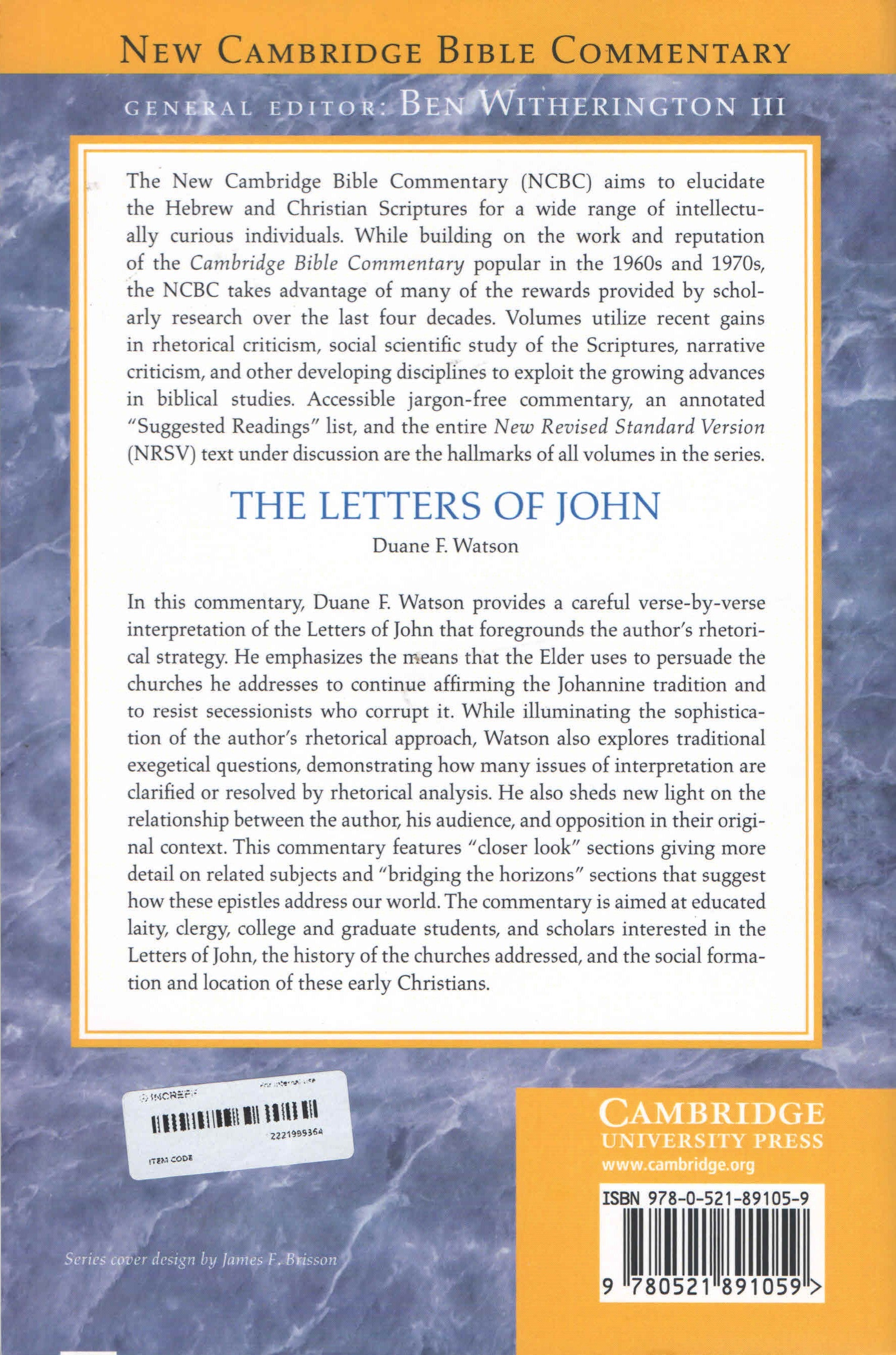 In this commentary, Duane F. Watson provides a careful verse-by-verse interpretation of the Letters of John that foregrounds the author's rhetorical strategy. He emphasizes the means that John uses to persuade the churches he addresses to continue affirming the Johannine tradition and to resist secessionists who corrupt it. While illuminating the sophistication of the author's rhetorical approach, Watson also explores traditional exegetical questions, demonstrating how many issues of interpretation are clarified or resolved by rhetorical analysis. He also sheds new light on the relationship between the author, his audience, and opposition in their original context. This commentary features 'closer look' sections giving more detail on related subjects and 'bridging the horizons' sections that suggest how these epistles address our world. The commentary is aimed at the educated laity, clergy, college and graduate students, and scholars interested in the Letters of John, the history of the churches addressed, and the social formation and location of these early Christians.