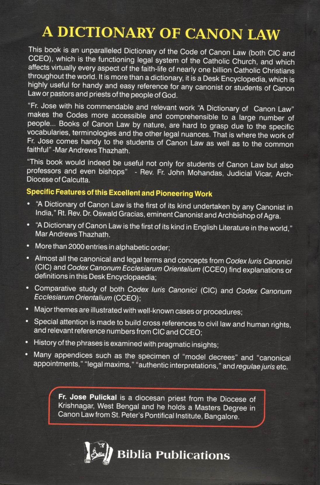 This book is an unparalleled Dictionary of the Code of Canon Law (both CIC and CCEO), which is the functioning legal system of the Catholic Church and which affects virtually every aspect of the faith-life of nearly one billion Catholic Christians throughout the world. It is more than a dictionary, it is a Desk Encyclopedia, which is highly useful for handy and easy reference for any canonist or students of Canon Law or pastors and priests of the people of God. This book would indeed be useful not only for students of Canon Law but also professors and even bishops.