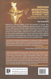 Marketing the diamond Jubilee of the CMI presence in Chanda Mar Thoma Province Chanda organized a one day seminar on 9th August 2022 at BJM Carmel Academy Higher Secondary School Auditorium Chandrapur Maharashtra this book contains papers presented in the seminar and other studies collected from erudite scholars of repute as these jubilee deliberations on mission have been shaped against the backdrop of the synodal way of being the church this collection has been titled as Indian Missional Horizons in Synodal Times.