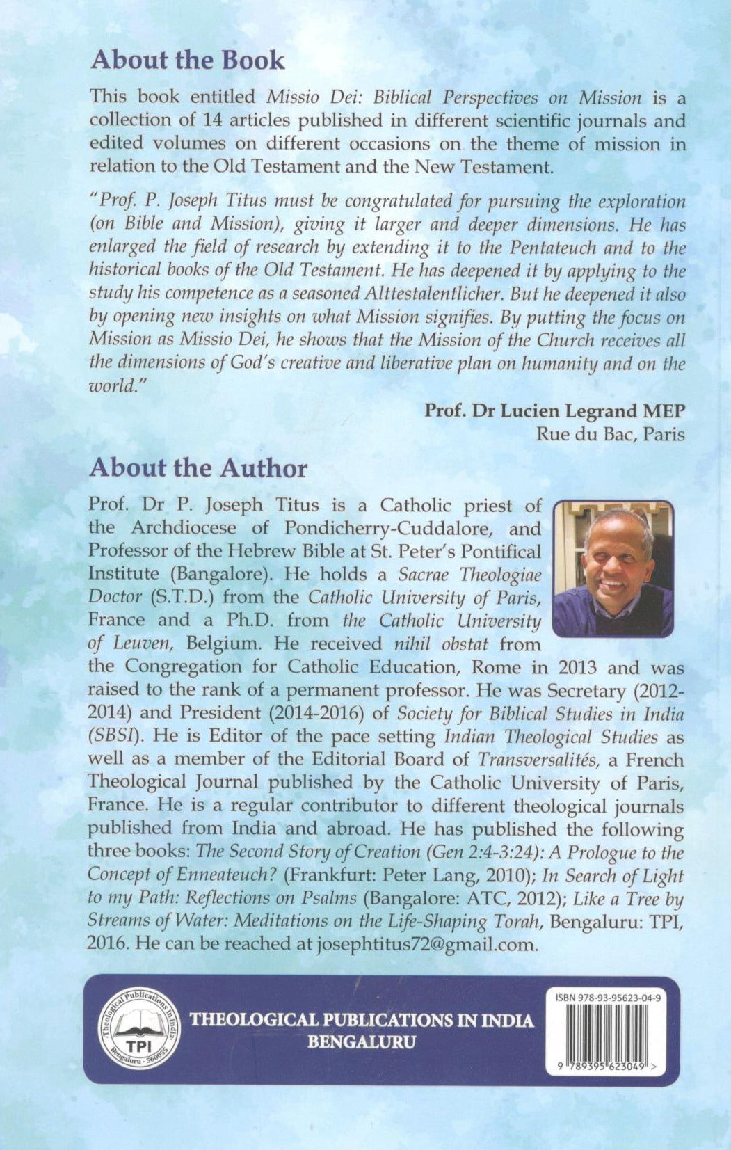 This book entitled Missio Dei - Biblical Perspectives on Mission is a collection of 14 articles published in different scientific journals and edited volumes on different occasions on the theme of mission in relation to the old testament and the new testament must be congratulated for pursuing the exploration giving it larger and deeper dimensions he has enlarged the field of research by extending it to the Pentateuch and to historical books of the old testament he has deepened it by applying to the study his competence as a seasoned but he deepened it also by opening new insights on what mission signifies by putting the focus on mission dei he shows that the mission of the church receives all the dimensions of God's creative and liberate plan on humanity and on the world.