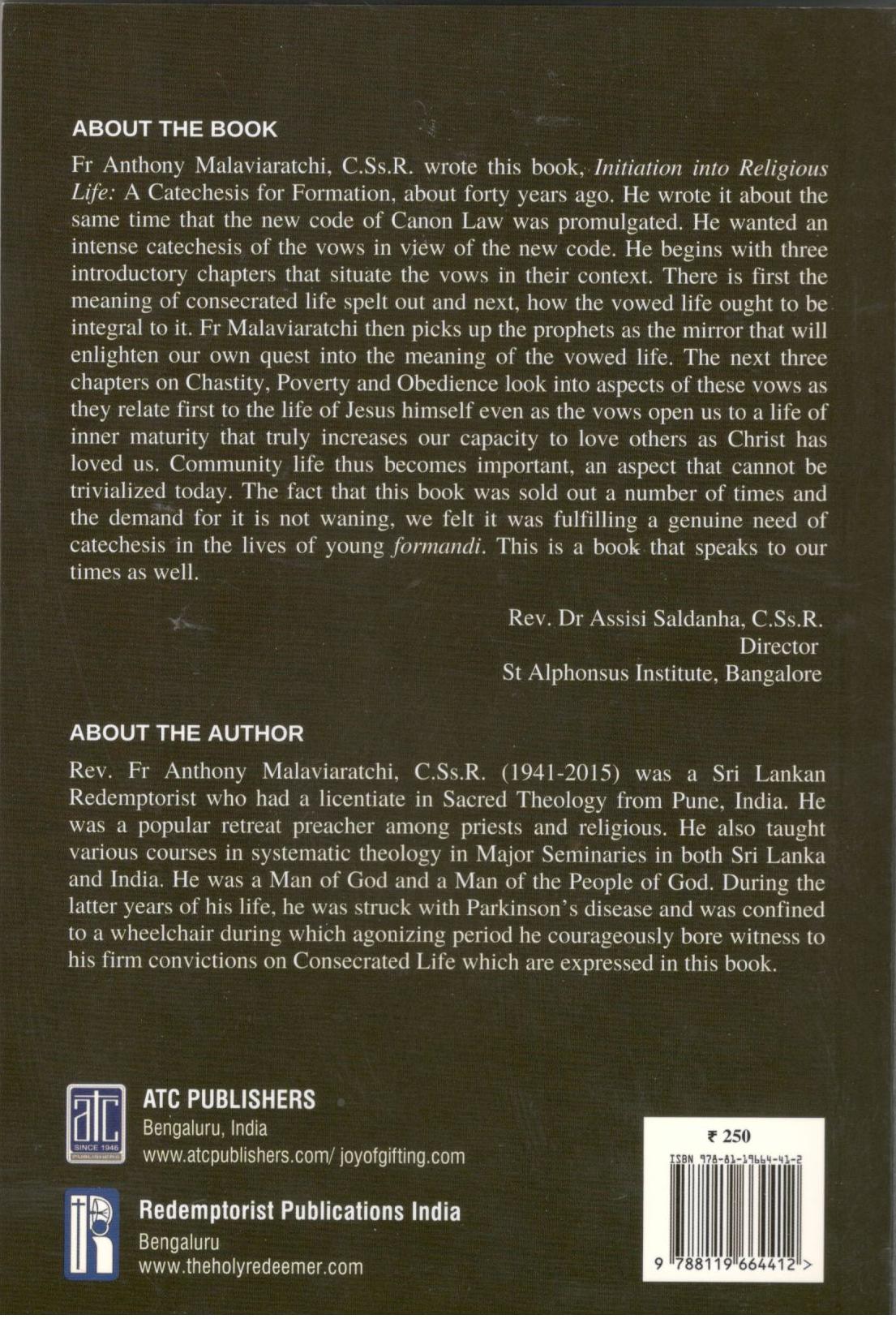 This book was written about forty years ago, the time that the new code of Canon Law was promulgated. He begins with three introductory chapters that situate the vows in their context. There is first the meaning of consecrated life spelt out and next, how the vowed life ought to be integral to it. Author then picks up the prophets as the mirror that will enlighten our own quest into the meaning of the vowed life. The next three chapters on Chastity, Poverty and Obedience look into aspects of these vows as they relate first to the life of Jesus himself even as the vows open us to a life of inner maturity that truly increases our capacity to love others as Christ has loved us. Community life thus becomes important, an aspect that cannot be trivialized today. The fact that this book was sold out a number of times and the demand for it is not waning, we felt it was fulfilling a genuine need of catechesis in the lives of young formandi. This is a book that speaks to our times as well.