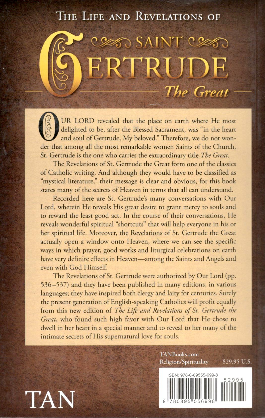 Recorded here are St. Gertrude's many conversations with Our Lord, wherein He reveals His great desire to grant mercy to souls and to reward the least good act. In the course of their conversations, He reveals wonderful spiritual "shortcuts" that will help everyone in his or her spiritual life. Moreover, the revelations of St. Gertrude the Great actually open a window onto Heaven, where we can see the specific ways in which prayer, good works, and liturgical celebrations on earth have very definite effects in Heaven among the Saints and Angels and even with God Himself.