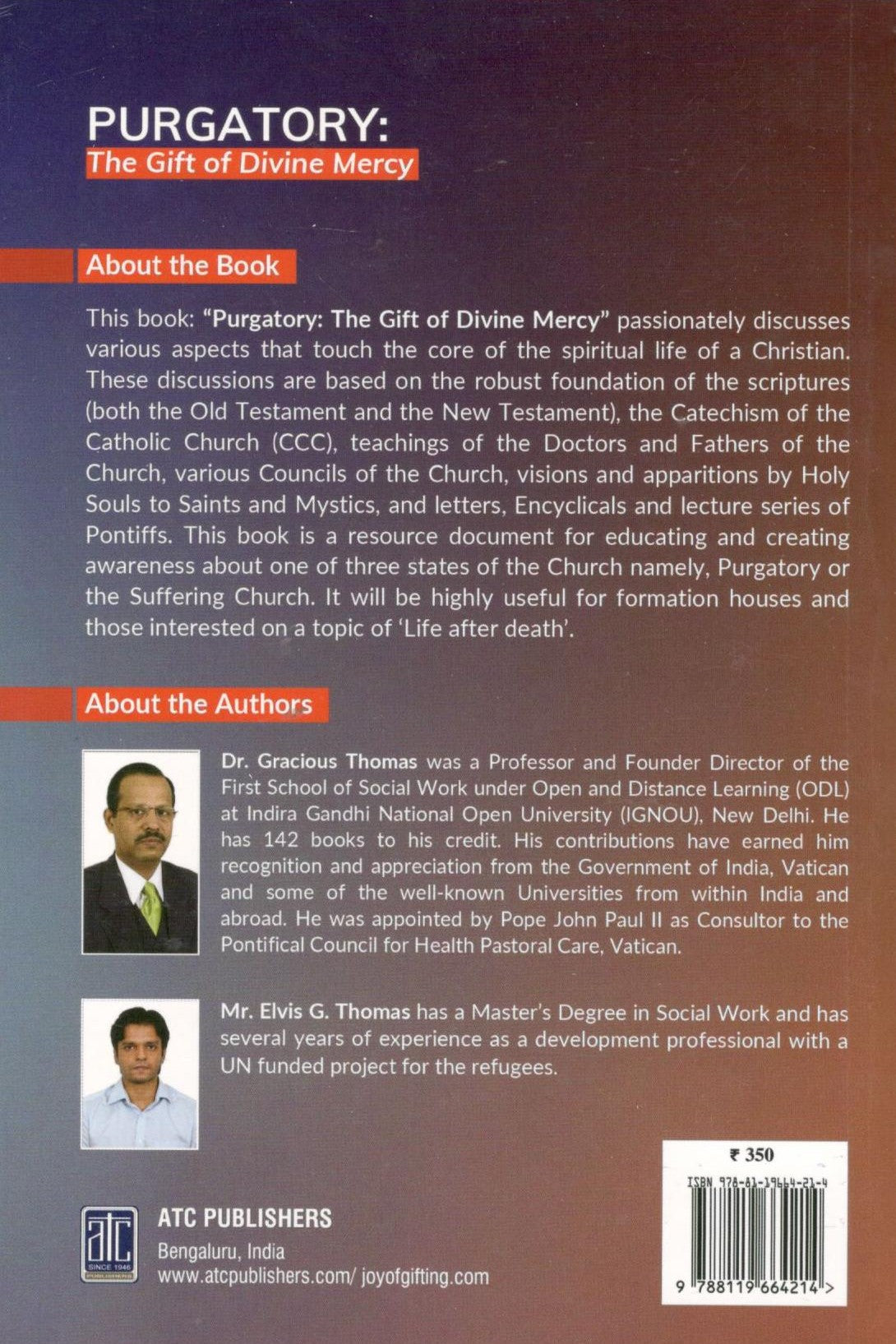 This book: "Purgatory: The Gift of Divine Mercy" passionately discussed various aspects that touch the core of the spiritual life of a Christian. These discussions are based on the robust foundation of the scriptures (both the Old Testament and the New Testament), the Catechism of the Catholic Church (CCC), teachings of the Doctors and Fathers of the Church, various Councils of the Church, visions and apparitions by Holy Souls to Saints and Mystics and letters, Encyclicals and lecture series of Pontiffs. This book is a resource document for educating and creating awareness about one of three states of the Church namely, Purgatory or the suffering Church. It will be highly useful for formation houses and those interested on a topic of 'Life after death'.