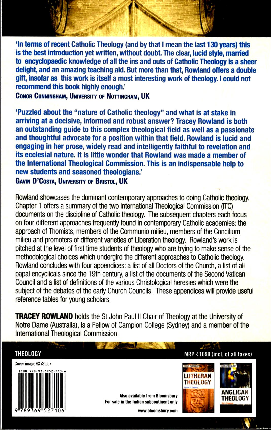 Rowland showcases here the dominant contemporary approaches to doing Catholic theology. Chapter 1 offers a summary of the two International Theological Commission (ITC) documents on the discipline of Catholic theology. These documents set out the general principles which should govern any approach to Catholic theology (at least according to the ITC). The subsequent chapters each focus on one of four different approaches frequently found in contemporary Catholic academies: the approach of Thomists, members of the Communio milieu, members of the Concilium milieu and promoters of different varieties of Liberation Theology.