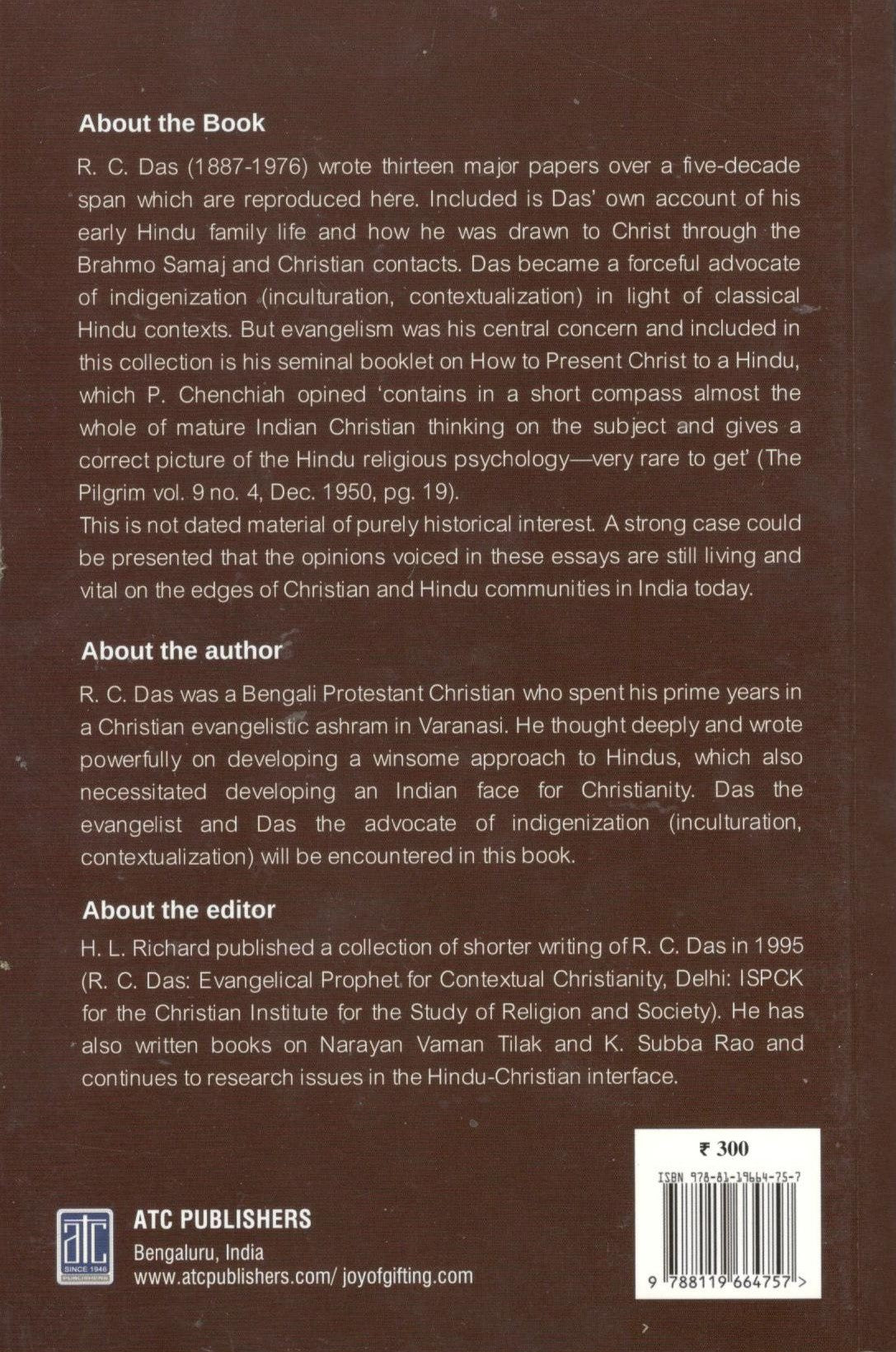R. C. Das wrote thirteen major papers over a five-decade span which are reproduced here. Included is Das` own account of his early Hindu family life and how he was drawn to Christ through the Brahmo Samaj and Christian contacts. Das became a forceful advocate of indigenization (inculturation, contextualization) in light of classical Hindu contexts. But evangelism was his central concern and included in this collection is his seminal booklet on How to Present Christ to a Hindu, which P. Chenchiah opined `contains in a short compass almost the whole of mature Indian Christian thinking on the subject and gives a correct picture of the Hindu religious psychology very rare to get.This is not dated material of purely historical interest. A strong case could be presented that the opinions voiced in these essays are still living and vital on the edges of Christian and Hindu communities in India today.These writings provide a stronger basis for analysing R. C. Das and his perspective on the church and its mission in the Hindu world. I have appended a section of a paper I wrote on Das outlining his teaching on religion and interreligious relations, particularly on the Hindu-Christian encounter, as that theme is particularly significant and appears at different points in these essays.