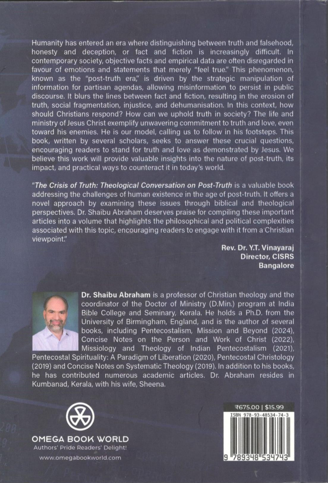 “The Crisis of Truth: Theological Conversation on Post-Truth is a valuable book addressing the challenges of human existence in the age of post-truth. It offers a novel approach by examining these issues through biblical and theological perspectives. Dr. Shaibu Abraham deserves praise for compiling these important articles into a volume that highlights the philosophical and political complexities associated with this topic, encouraging readers to engage with it from a Christian viewpoint.”