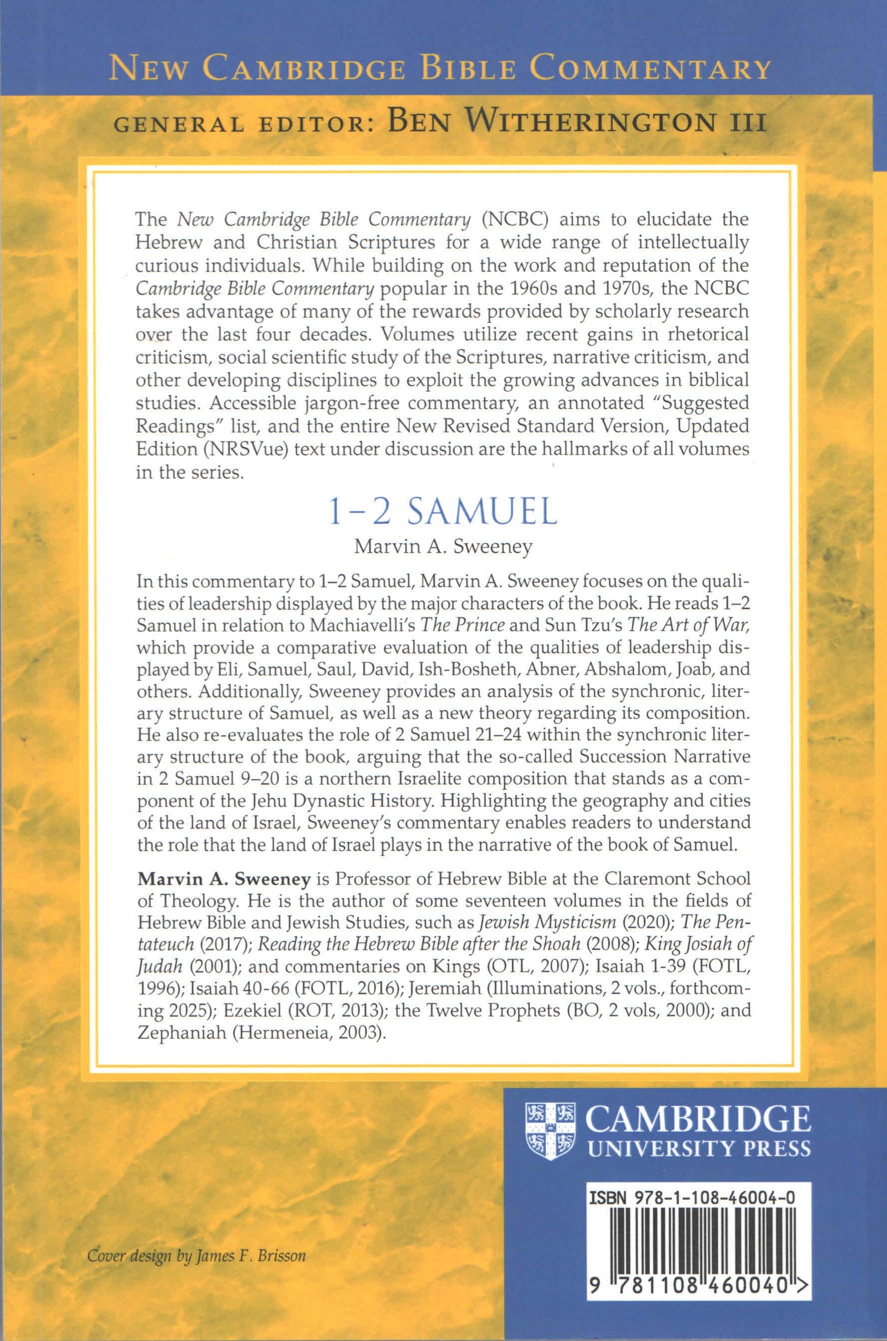 In this commentary to 1–2 Samuel, Marvin Sweeney focuses on the qualities of leadership displayed by the major characters of the book. He reads 1–2 Samuel in relation to Machiavelli's The Prince and Sun Tzu's The Art of War, which provide a comparative evaluation of the qualities of leadership displayed by Eli, Samuel, Saul, David, Ish-Bosheth, Abner, Abshalom, Joab, and others. Additionally, Sweeney provides an analysis of the synchronic, literary structure of Samuel, as well as a new theory regarding its composition. He also re-evaluates the role of 2 Samuel 21–24 within the synchronic literary structure of the book, arguing that the so-called Succession Narrative in 2 Samuel 9–20 is a northern Israelite composition that stands as a component of the Jehu Dynastic History. Highlighting the geography and cities of the land of Israel, Sweeney's commentary enables readers to understand the role that the land of Israel plays in the narrative of the book of Samuel.