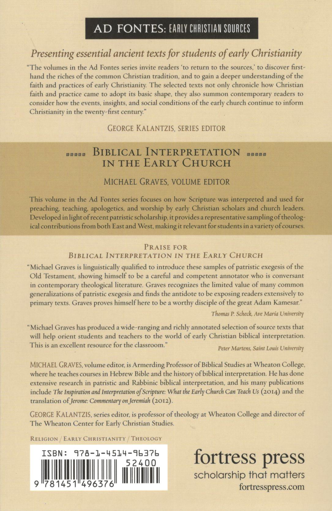 It is a part of Ad Fontes : Early Christian Sources, a series designed to present ancient Christian texts essential to an understanding of Christian theology, ecclesiology, and practice. The books in the series will make the wealth of early Christian thought available to new generations of students of theology and provide a valuable resource for the Church. This volume focuses on how Scripture was interpreted and used for preaching, teaching, apologetics, and worship by early Christian scholars and church leaders.