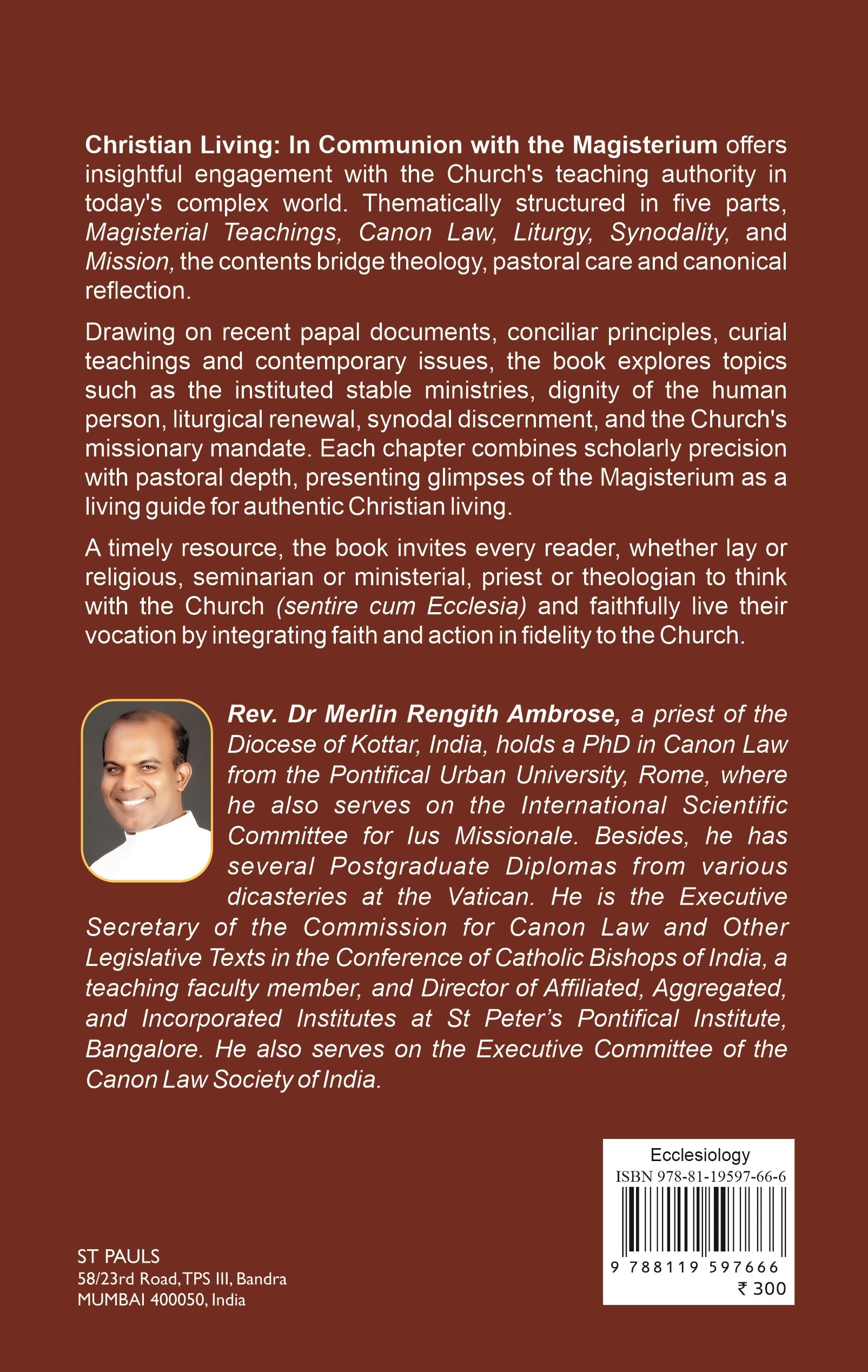 Christian Living: In Communion with the Magisterium offers insightful engagement with the Church’s teaching authority in today’s complex world. Thematically structured in five parts, Magisterial Teachings, Canon Law, Liturgy, Synodality, and Mission, the contents bridge theology, pastoral care and canonical reflection. Drawing on recent papal documents, conciliar principles, curial teachings and contemporary issues, the book explores topics such as the instituted stable ministries, dignity of the human person, liturgical renewal, synodal discernment, and the Church’s missionary mandate. Each chapter combines scholarly precision with pastoral depth, presenting glimpses of the Magisterium as a living guide for authentic Christian living.