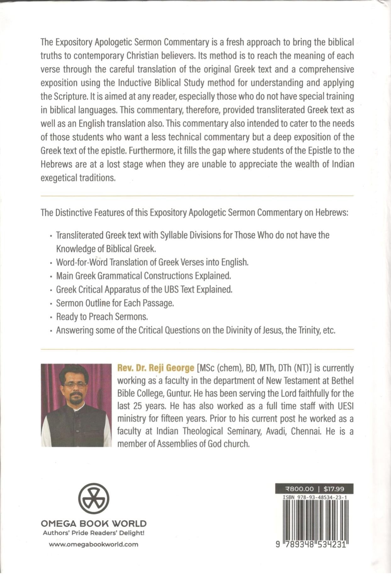The Expository Apologetic Sermon Commentary is a fresh approach to bring the biblical truths to contemporary Christian believers. Its method is to reach the meaning of each verse through the careful translation of the original Greek text and a comprehensive exposition using the Inductive Biblical Study method for understanding and applying the Scripture. It is aimed at any reader, especially those who do not have special training in biblical languages. This commentary therefore provided transliterated Greek text as well as an English translation also. This commentary also intended to cater to the needs of those students who want a less technical commentary but a deep exposition of the greek text of the epistle.