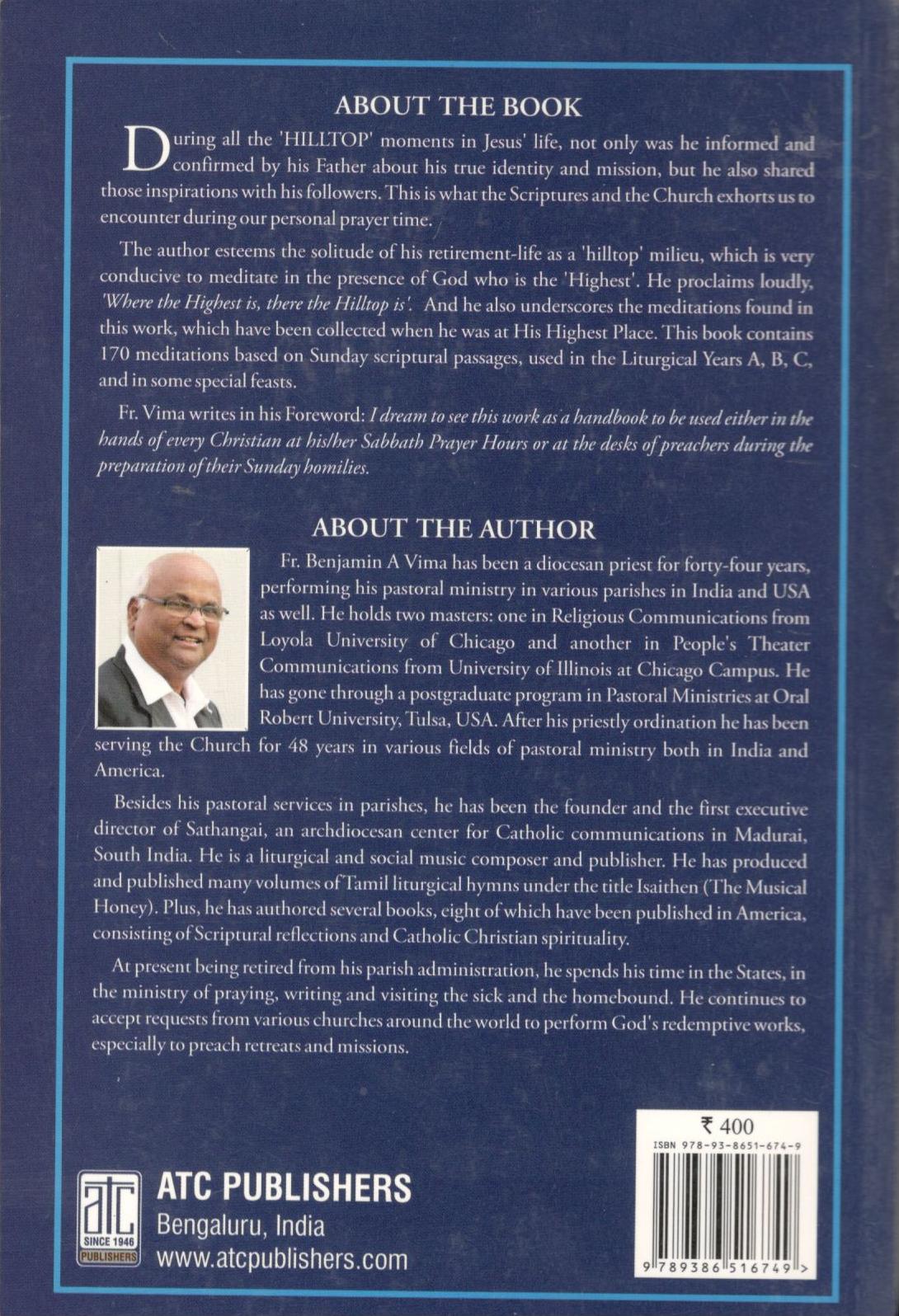 During all the 'HILLTOP' moments in Jesus' life not only was he informed and confirmed by his father about his true identity and mission, but he also shared those inspirations with his followers. This is what the scriptures and the Church exhorts us to encounter during our personal prayer time. The author esteems the solitude of his retirement life as a 'hilltop' milieu, which is very conducive to meditate in the presence of God whos is the Highest. He proclaims loudly, 'Where the Highest is, there the Hilltop is'. And he also underscores the meditations found in this work, which have been collected when he was at his Highest Place. This book contains 170 meditations based on Sunday scriptural passages. used in the Liturgical Years A, B, C and in some special feasts.