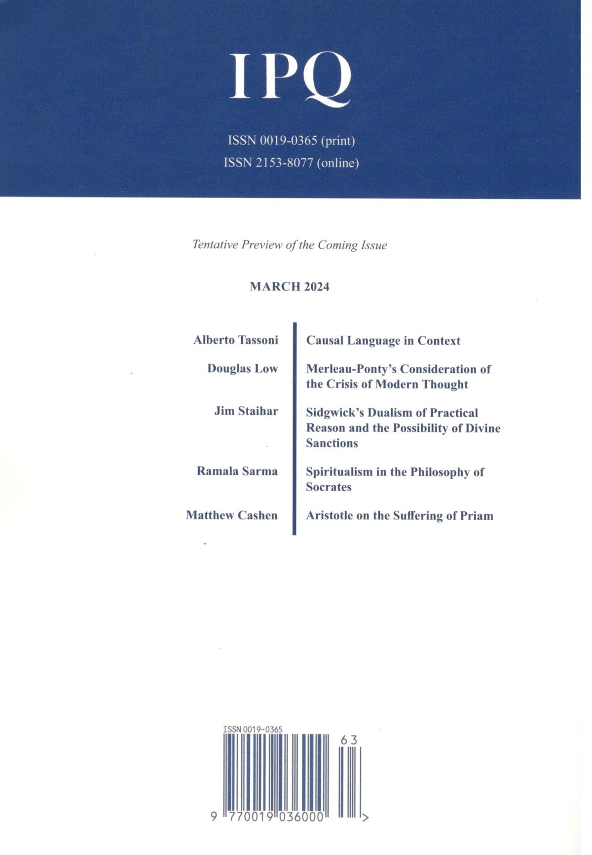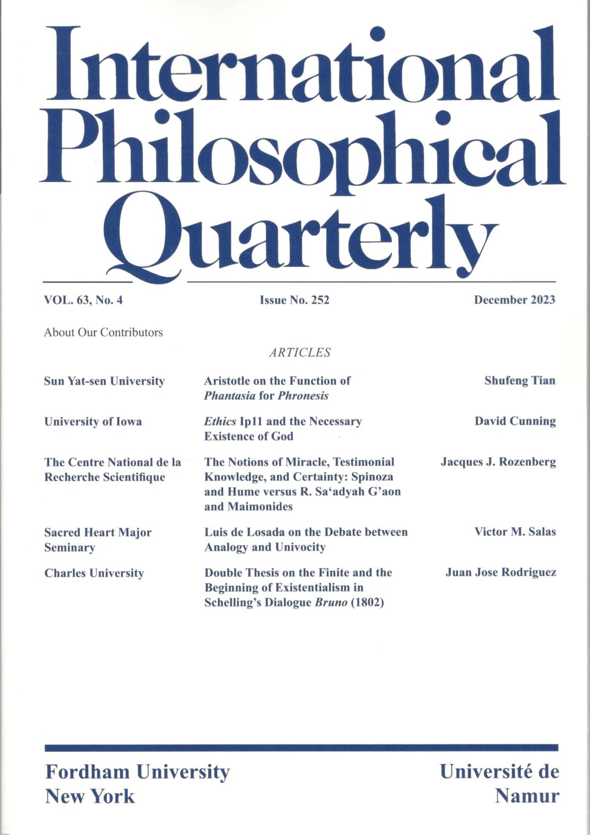 Since 1961 International Philosophical Quarterly has provided a peer-reviewed forum in English for the international exchange of basic philosophical ideas. The journal stands in the general tradition of theistic and personalist humanism without further restriction of school or philosophical orientation, and is open to the philosophical discussion of contemporary issues and historical studies. Truly international in scope, IPQ enjoys a long-standing relationship with the Université de Namur in Belgium.