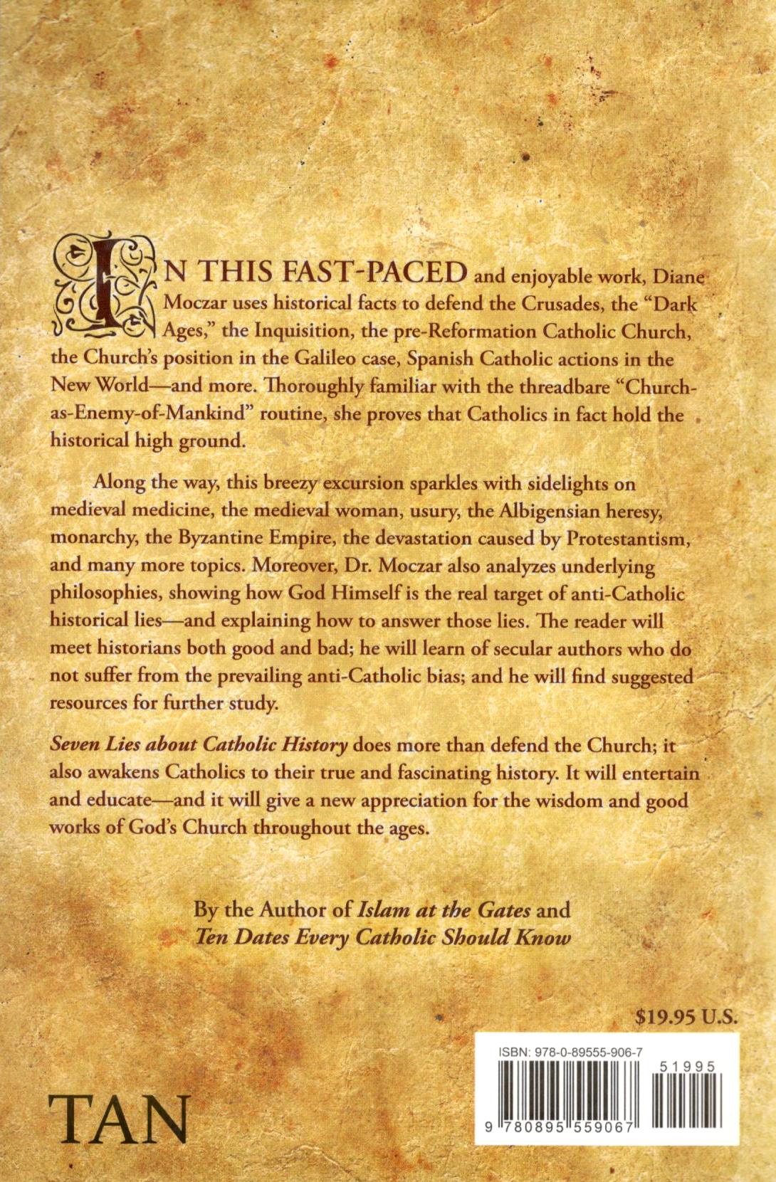 In Seven Lies about Catholic History, Diane Moczar (author of Islam at the Gates) tackles the most infamous and prevalent historical myths about the Church—popular legends that you encounter everywhere from textbooks to T.V.—and reveals the real truth about them. She explains how they got started and why they're still around, and best of all, she gives you the facts and the arguments you need to set the record straight about:
