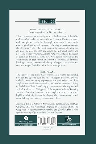 The letter to the Philippians illuminates a warm relationship between the apostle Paul and the Philippian believers. Despite difficult situations being experienced on both sides, Paul finds ample reason to celebrate what God in Christ has done and is doing in the believers' lives. Jeannine K. Brown's commentary explores the themes of this epistle, how its message is still relevant to Christians in the twenty-first century. She shows how motifs of joy, contentment and unity abound as Paul reminds the Philippians of the supreme value of knowing Jesus the Messiah, and highlights their significance for shaping the contemporary church towards living more deeply its identity in Christ. Part of the Tyndale New Testament commentary series, Philippians: An Introduction and Commentary examines the text section-by-section – exploring the context in which it was written, providing thoughtful commentary on the letter to the Philippians, and then unpacking its theology. It will leave you with a thorough understanding of the content and structure of Paul’s writing, as well as its meaning and continued relevance for Christians today. The Tyndale New Testament Commentaries are ideal Bible commentaries for students and teachers of theology, as well as being usable for preachers and individual Christians looking to delve deeper into the riches of Scripture and discover its meaning for today. Insightful and comprehensive, Jeannine K. Brown’s commentary on Philippians is a brilliant introduction that will give you a renewed appreciation for this rich Pauline epistle and a greater knowledge of why it is important to the Christian faith.